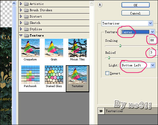 18.下面来处理宝宝的照片更像油画的效果,先把宝宝的照片图屋复制一层,要对上面这层进行下面的操作.选"滤镜"(filter)菜单下的"纹理"(texture)会出来下面这个面板,选canvas 就是油画布效果,再把下面两个数值调整得你认为合适,一个是纹理的大小,一个是纹理的深度,根据我们处理的照片像素大小不同这个值会变化的才会看起来合理.