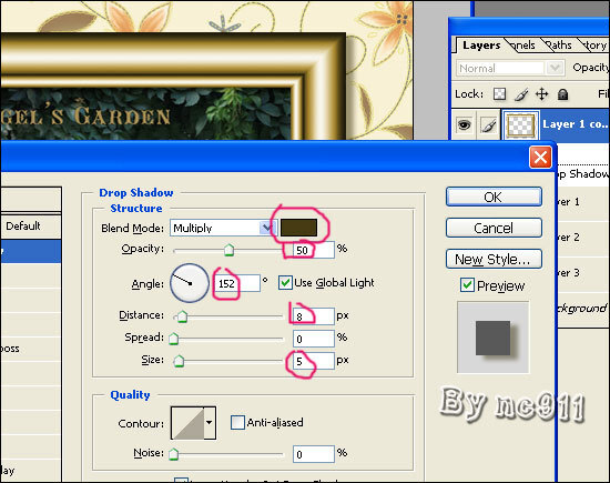 17.现在看起来像是一幅油画平贴在墙上的,咱们还要给画框在墙上做出些阴影来才更像是立体的实物.先把画框的四个边拼合为一个图层,在图层面板上双击这个图层会出现一个图层效果的窗口.需要改动的地方我用红圈标出来了.从上到下第一个是阴影的颜色要改成和整体环境相符的色调的阴影,第二个是阴影的不透明度,默认的不透明度太高显得不够真实,第三个是阴影的角度,第四个是阴影离物体的距离,第五个是阴影虚化的像素值.