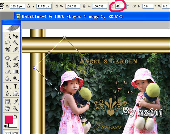 10.然后在属性栏上旋转角度就是画红圈的这里输入45,将浮动矩形选区旋转45度.然后对准四个角的位置一共切四次哦,不是8次,妈妈们要考虑好在四个边的哪个图层切.