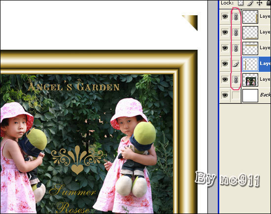 13.切好后再把四个边框以及宝宝的照片这里链接上,再一齐移动这些图层,会发现周围还有一些没完全擦除干净的画框碎屑,用橡皮擦也好,短形浮动选择后删除也行.