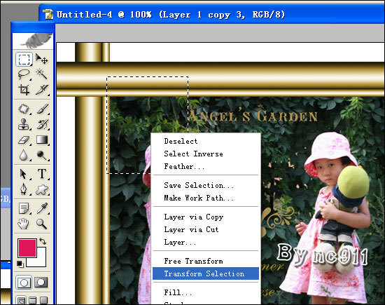 09.再把宝贝的照片拖到四个画框边下面的图层,好根据照片来调整四个边的位置.再用工具栏左上角的矩形选框工具在图上画个矩形,不用太大也不要太小,要每个边足够更号2倍的框宽度哦.用它来把四个框切画框四边拼合的样子.注意必须在工具栏矩形选框的状态下,鼠标放在浮动框位置点右健选选区变形这项.