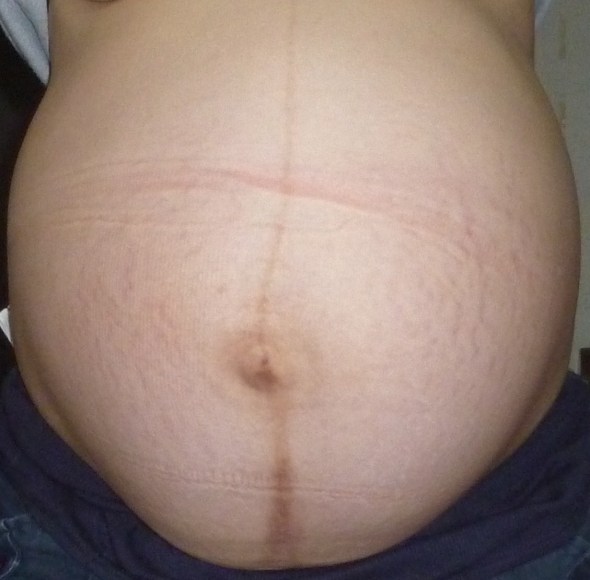 11、肚脐以上妊娠线直、细、直达两乳间男,反之女;(怀女儿时线比较粗、直。怀儿子时细,不直)