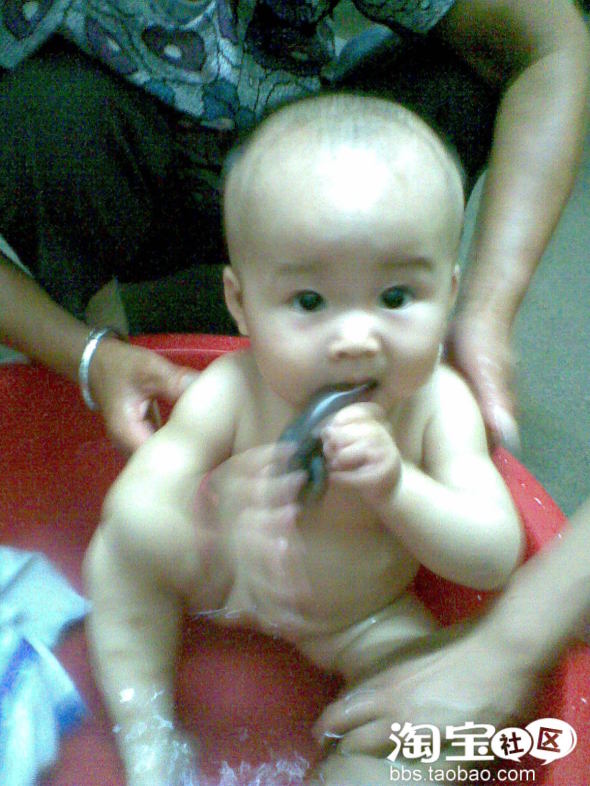 彬彬十个月时候,姥姥把我洗澡,很舒服,一边洗澡,一边啃着小鸭。