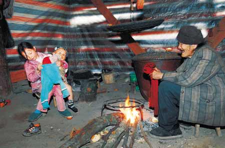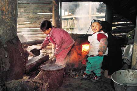 弟弟不小心把裤子尿湿了,于是她就在火塘边,帮弟弟换起了裤子。