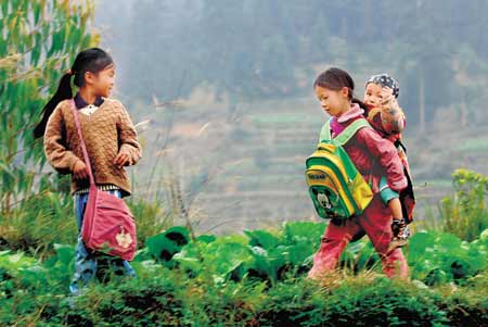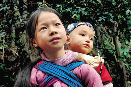 冬天的贵州,正是“天无三日晴”,我们到那里的几天,天都是阴沉沉的,不时飘来一些小雨。当我们在月亮山区的从江县大洞村发滑的山道上艰难行走时,发现一个背着小孩的小女孩正向我们迎面走来。