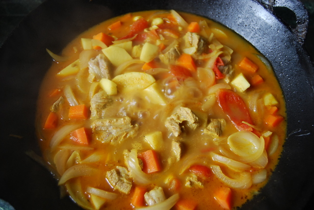 做法:炒锅油热后,放进 蒜头、切成丝的洋葱头、炒到洋葱丝变色发软,放进土豆丁 胡萝卜丁 西红柿丁 青椒红椒丁 继续煸炒几分钟,放进排骨,炒几下;最后放咖喱酱炒拌均匀,放入开水,淹没原材料即可