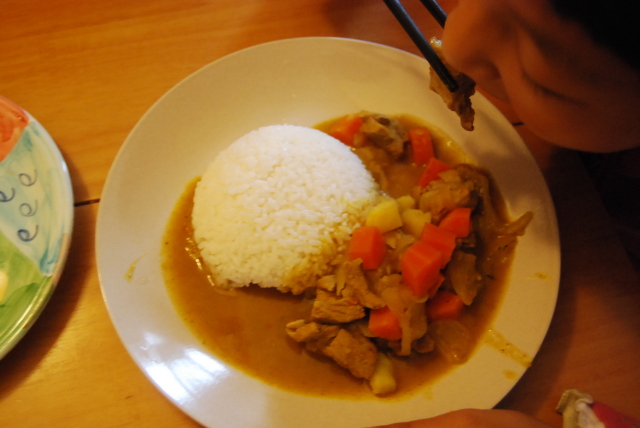 金黄的咖喱、软烂的排骨、浓浓的材料丰富的酱汁,浇在饭上。真是太美味了