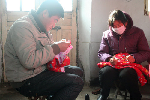 2010年1月3日,青岛,陶华江娘俩修改小棉衣。