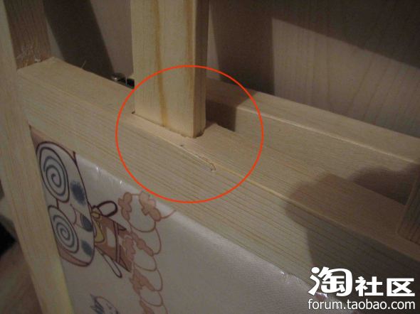 以上照片都是拍自床体上部,毛刺和接合处的孔洞是普遍现象,床体下部的问题更多,但宝宝不容易接触到,因为也没必要再细究。床体上部接合处的孔洞大部分在0.8*0.6CM左右,普通成人的食指直径约为1.6CM,0-3岁宝宝的手指直径大概是成人的1/3,也就是0.5CM左右。床上所存在的孔洞的危险性可想而知!