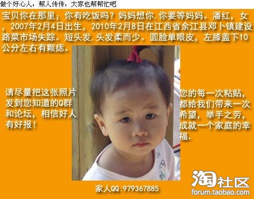 这些场景大家都应该在身边看过,原本他们有着跟我们宝宝一样的快乐童年。可让那些不法分子夺走了。让我们做些自己力所能及的事帮一起找回失踪的小潘红吧!
