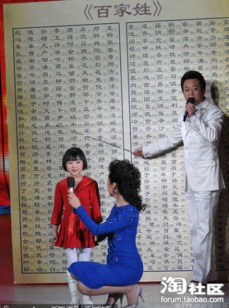来自教育论坛):这种无聊的事爱因斯坦都不做,这跟背字典有嘛区别??展示中国的传统文化不在于让小孩去背百家姓……如果是展示孩子的记忆力更没有必要,如果真的想表现中国文化,去做一个类似于天天向上里的那个讲传统文化的节目就挺好,轻松幽默还让人记得住,总之我认为这样的节目是可以搬上春晚的舞台。而小孩子去背百家姓,如果是她的兴趣,念一念背一背道没什么不好,但是上了春晚,光是这样的背诵绝对会对家长们形成误导,让自己的孩子去背……那就不是个娱乐节目了。