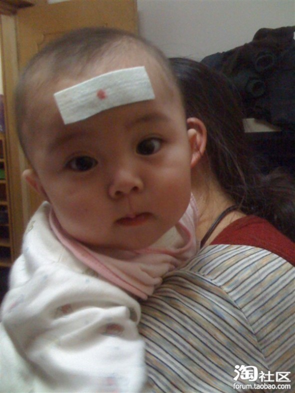由于妈妈夜里睡的忒死了,以至于我把被子踹了妈妈都不知道,所以第二天我的脑袋上就被贴了这么个东西,说是物理退烧,爷爷还幸灾乐祸的往上边嘟了个红点,奶奶抱着我,说我叫起来跟小猫咪似的,可怜的孩子