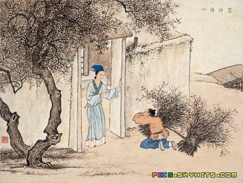 蔡顺,汉代汝南(今属河南)人,少年丧父,事母甚孝。当时正值王莽之乱,又遇饥荒,柴米昂贵,只得拾桑葚母子充饥。一天,巧遇赤眉军,义军士兵厉声问道: “为什么把红色的桑葚和黑色的桑葚分开装在两个篓子里?”蔡顺回答说:“黑色的桑葚供老母食用,红色的桑葚留给自己吃。” 赤眉军怜悯他的孝心,送给他三斗白米,一头牛,带回去供奉他的母亲,以示敬意。