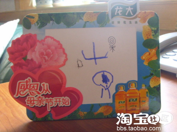 昨天是母亲节,前天傍晚就收到儿子送的母亲节礼物,幼儿园统一发的某品牌花生油赞助小画框一个,上面儿子手绘的抽象派画作