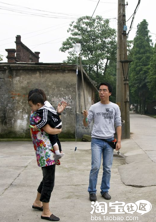 我在路上看到一对夫妻,妻子抱着小孩,丈夫举着吊瓶,