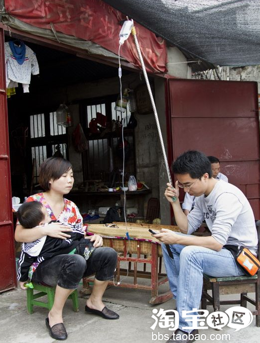 小孩没有住院,在家打吊针。妈妈抱着孩子,爸爸就一直这样举着吊瓶,我看到他们都很疲劳的样子。