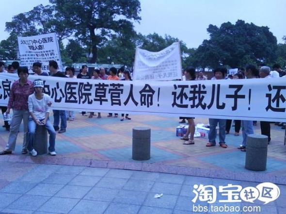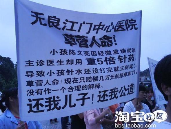事情发生于2010年5月11号江门中心医院,听当事人说:生了一对可爱的龙凤胎,小孩今年刚满一岁,11号那天儿子有点轻微发烧,烧到38度,主诊医生开了瓶吊针水,在打吊针水几分钟后发现儿子的神情脸色开始异常,7孔流血,立刻送到急救室,抢救无效死亡,后来经检验是医生开错药,药水的分量竟然开重了5倍的分量,导致小孩肾衰缺死亡。