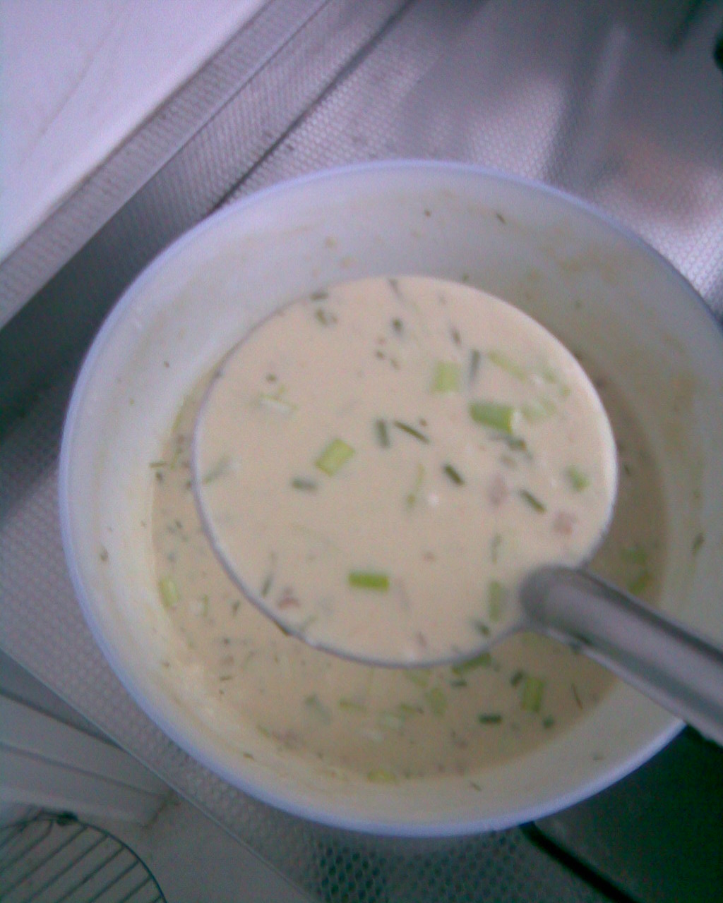 (3)最后把切好的葱和鸡蛋、盐倒入面粉糊中,搅拌均匀。如下图所示(我在里面还放了昨天省的饺子馅,看着里面比较乱):