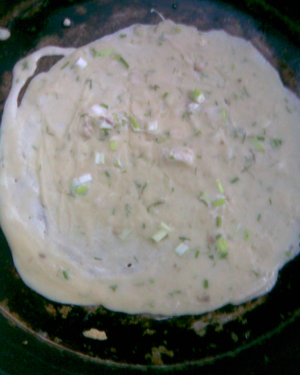 (6)我摊的还不算匀,差不多就行了,反正是自己吃哈!等到底面差不多熟了,翻面如下图