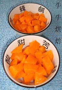 芒果去皮,取250g果肉切大块,令一半芒果切小丁;