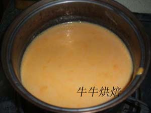 吉利丁片用50g牛奶泡软;剩余下的牛奶加白砂糖小火加热融化;(注意不要沸腾)将泡软的吉利丁片加入热牛奶中融化,加入香草粉(吉士粉)混合均匀;将芒果奶油和牛奶混合均匀;