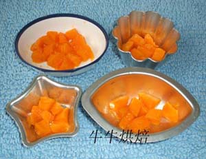 在模具里先撒上少许芒果粒;(或将芒果粒与果浆混合)将混合的果浆倒入模具里,在桌上轻磕出气泡后