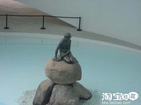 接着去了【丹麦馆】在绿色通道排了20分钟进去了,看到了传说中从本国运来的美人鱼像,远远的立在水池中,可惜池子里没有鱼儿陪伴她,看上去有点寂寞。此馆是像个海螺一样的建筑,延着环行的通道走到的顶上,旁边还有人骑自行车同行,露天的顶上有个间歇喷泉,儿子好兴奋,衣服湿了一半。