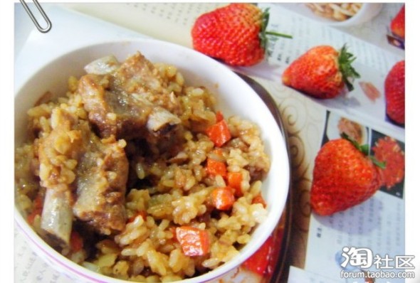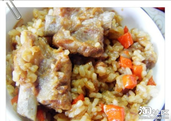 酱排骨炒米饭。小宝同学不爱吃肉但爱啃骨头,所以我就常买排骨给她啃啃。炝锅后放入排骨和少许排骨汤,再放入胡萝卜丁,然后挖一小勺大酱小火焖一会排骨,待收余少许汁时放入米饭再翻炒几下即可。此款米饭很符合她的要求,有肉香有酱香还有骨头啃啃。