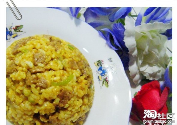 咖喱牛肉类炒米饭。买的咖喱酱里面肉少,我买的咖喱粉,放了牛肉类和土豆块,量足!