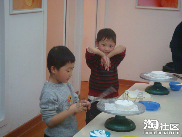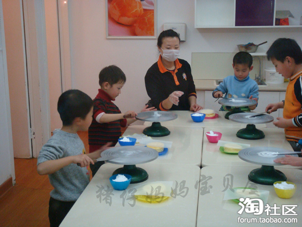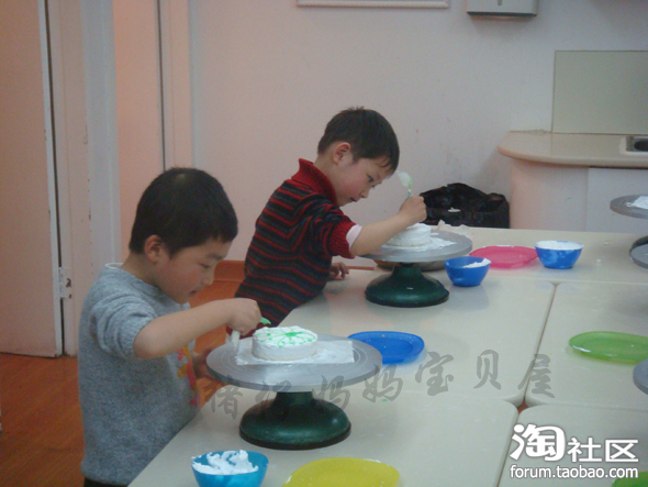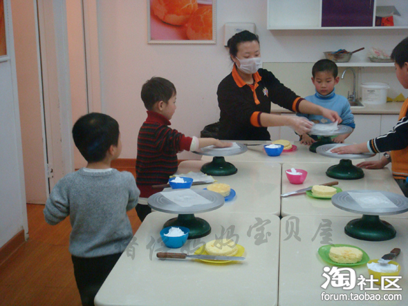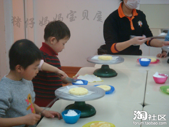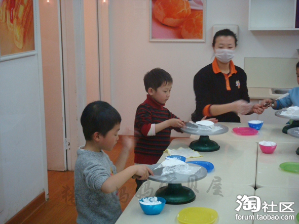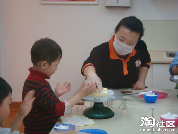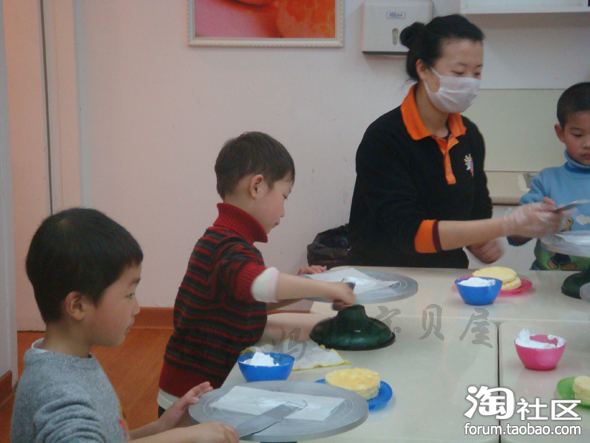 宝贝喜欢做蛋糕,花了30元E币来到烘焙屋培训,开始做蛋糕啦!