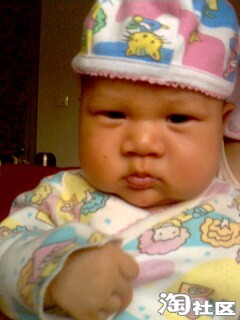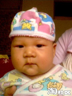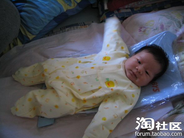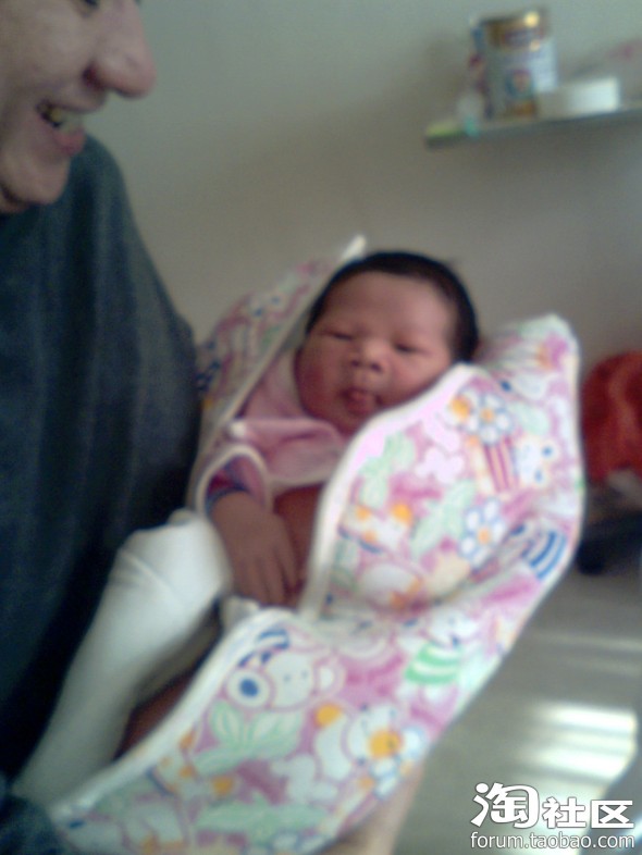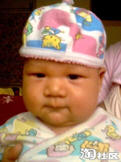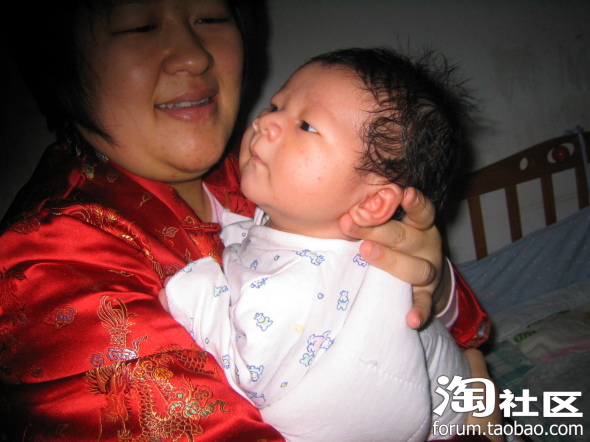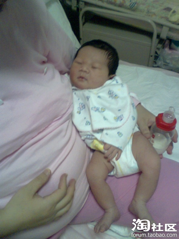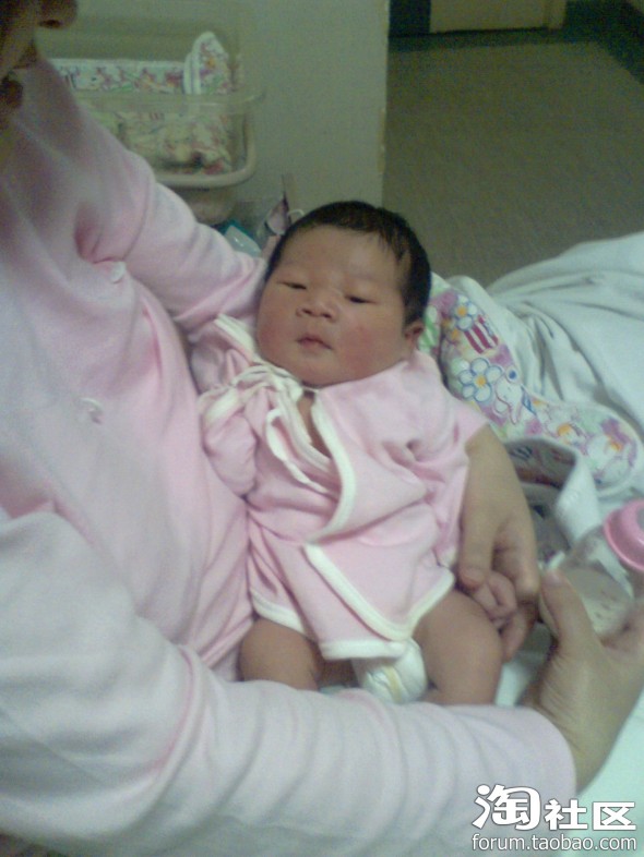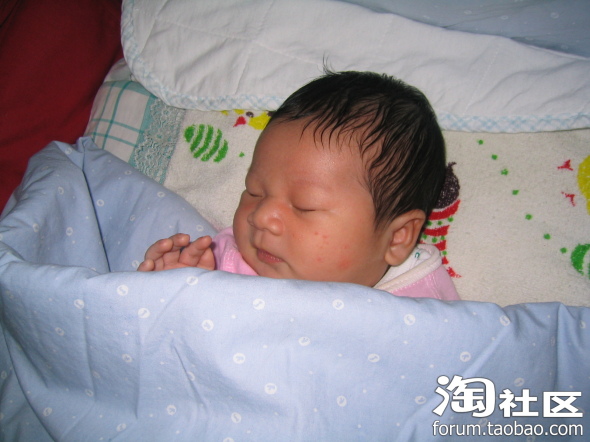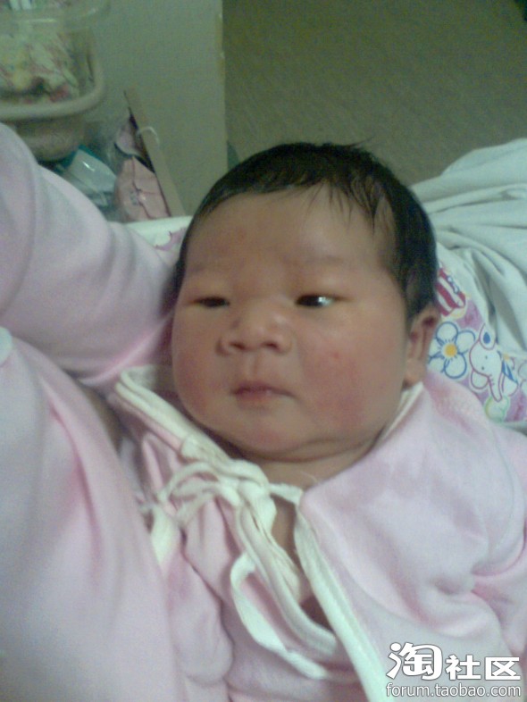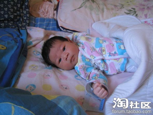 这是宝宝出生第二天的照片,胎发很好啊,可能跟我孕后期每天吃炒黑芝麻有关,就是有点继承了我的肿眼泡,他爸也有点,把双眼皮儿都给挤没了,不过黑眼仁儿还是很精神的,没出院时就能追视移动的物体(主要是查房和护理时的护士,)因为宝在我肚子里的时候我就经常用灯光照肚皮刺激他的视觉(书上看来的),有想学的要注意光不能太强,时间也不宜太长,最好是闪射。还有经常让胎儿听音乐,跟胎儿聊天,对宝宝的听力也有好处,宝宝刚出生没几天听到电视里放出乐声就会侧着耳朵静静听,护士都惊叹呢!叫他的名字mickey,他也会有反应。皮肤红红的,而且好像有点浮肿,大概是在羊水里泡得吧,这时我还没下床活动,喂奶也不方便,宝宝都是他爸照顾,给喂奶粉,基本上四个小时一次,吃饱就呼呼睡,醒了就拉尿,一天要排十几次小便,大便七八次,不知我有没有记错,反正次数很多,排出来的都是绿色的胎粪。