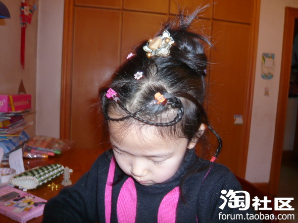 逛商场时在流行美发饰专柜看了会儿,学会了几种发型。在女儿脑袋上试了试,