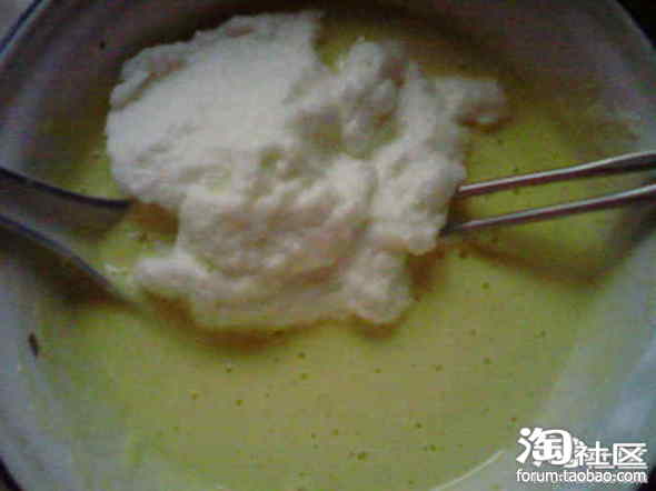 将“奶油”混入加入牛奶面粉的蛋黄中~哈哈