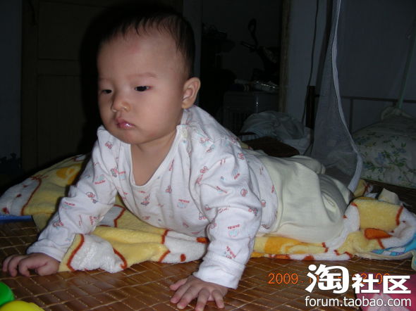 2009年10月6日,儿子这二天已经会小爬二步了,会用自己膝盖用力了,现在在床上他到处爬,想要去哪就去哪,真拿他没办法。