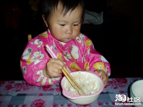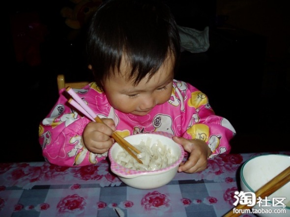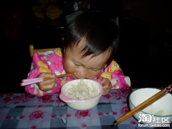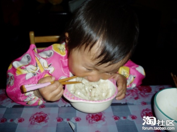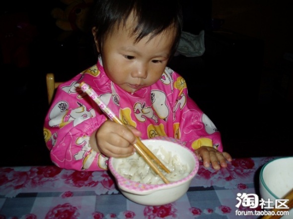 这么爱用筷子,今天索性给她买了一双小筷子,一来不用再跟我抢了,二来练习起来更省力。没想到小家伙第一次拿到自己的小筷子就吃得有模有样了,压根都不让我们碰她的小碗了,哈哈