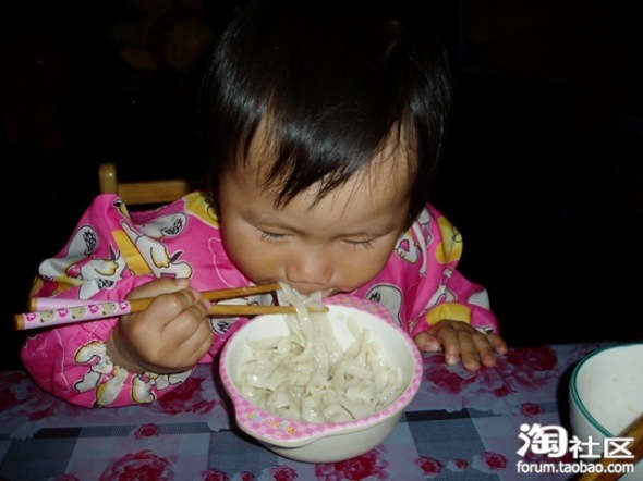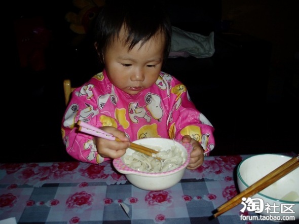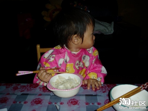。所以每次看我们大人用筷子吃饭夹菜,她总是一付跃跃欲试的样子,时不时的就要抢占我的筷子来研究,看她那小小人的样子,拿着个超大号的筷子在盘子里推来推去却什么也吃不着,好笑的,可她还是乐此不疲,实在吃不进嘴里的时候就会上手,简单速度,哈哈。