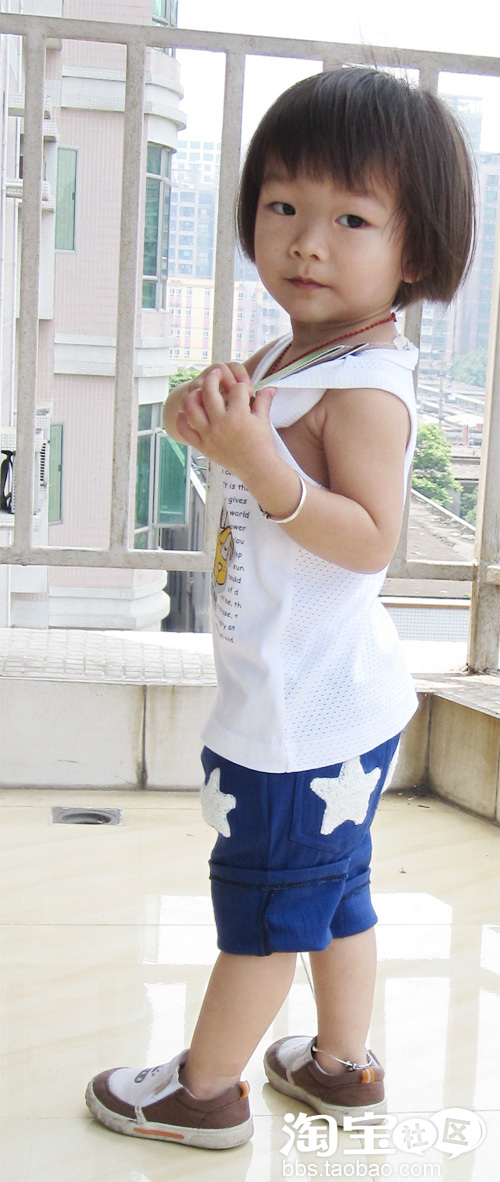 一件白色背心+蓝色热裤,很中性的打扮,很有个性的哦!