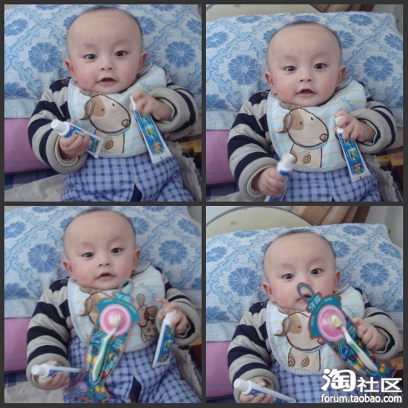 平时吃饭的时候都是习惯抱着宝宝吃的,坐在腿上宝宝也特别乖从不闹的很配合大人吃饭,今天中午像往常一样抱着他吃饭,他的小手一下子就抓住我的饭碗,还好我反应快赶快掰开他的小手,把饭碗扣了是小事万一把宝宝的小手烧着可是大事呀,那我在全家人面前都没话说了,是自己不小心造成的后果,不过还好没有,看来以后吃饭的时候还是把他放推车里好,他现在已经认识碗和勺了,只要看到就想用手抓,还老爱抢我的筷子,宝宝为了你的安全以后你只有躲在车车里看看妈妈吃饭的份了,呵呵~~~今天还有一件事宝宝的美丽健牙擦收到了,是免费试用的哦让大家看看吧