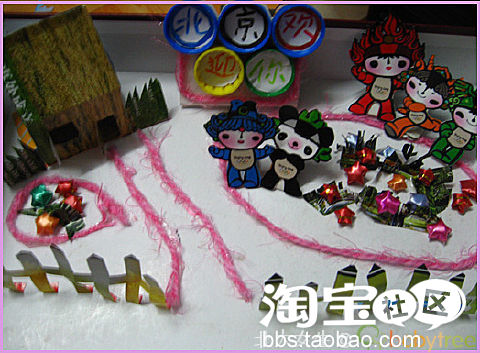 这个手工作品的材料都是用废旧的物品做的:矿泉水瓶(北京欢迎你);旧杂志(小房子.栅栏.福娃);衬衫盒