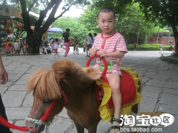 看我的呆儿子坐这一头小马,在边上转一小圈20元,别人就让他下来了,因为人多相片没拍好就被轰下来了,儿子哭得不行了,没办法加20再转一圈!