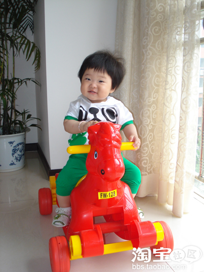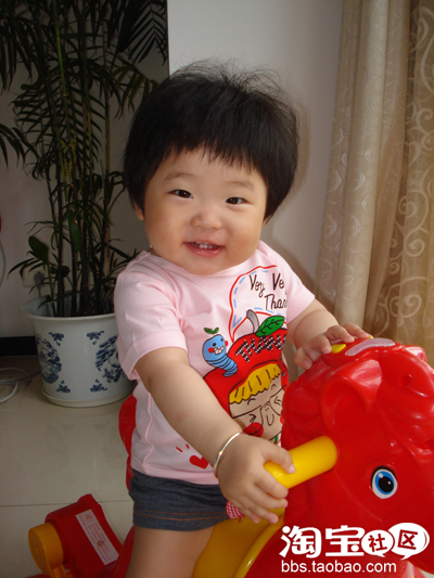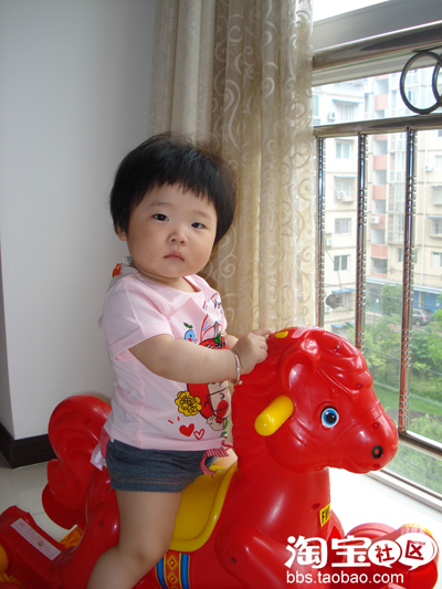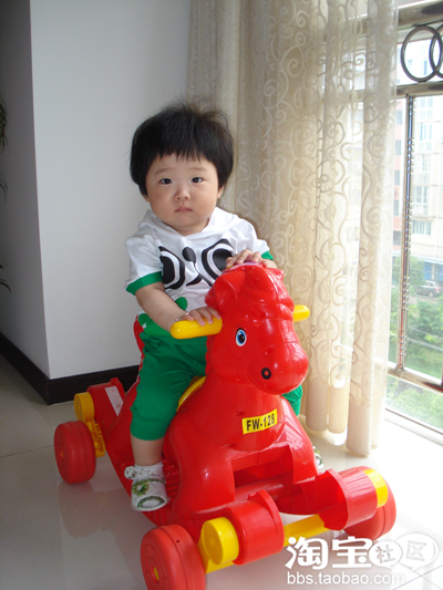 这是刚拍的哟,十一个月大了。可以给珊珊爸当麻豆了呢。有点臭美了,喜欢照镜子。穿着新衣服,骑着最喜欢的马儿,有点得意忘形了!