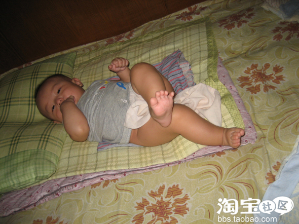 1、宝宝四个月大时:我们吃晚饭,把他一个人放在床上玩,过一会我会不经意地看一下他,担心摔下来,某一次我不经意地看他时,呵呵,发现他的一条腿放到另一条腿上做了个 ”二郎腿“的姿势,我被惊住了,赶紧拿相机记录下来: