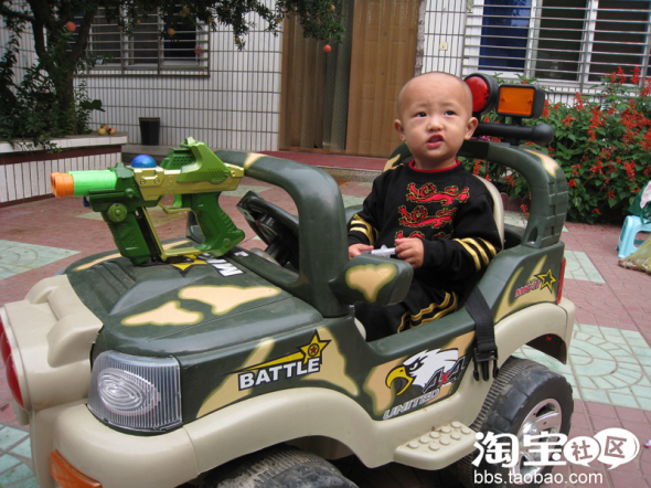 3、宝宝一周半时:爷爷买了辆电动小汽车给他,他那个高兴劲呀,呵呵,还用说不清楚的话语跟爸爸挑战”爸爸,来晒(赛)车“偶的天呢,好可爱哟。