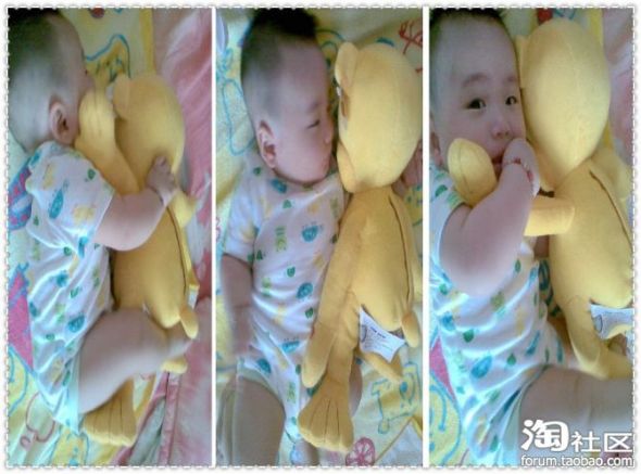 一翻身,感激地抱着我。。。。。。。在外婆家陪伴我最多的除了我那娘外就是这只熊了,外公外婆白天都很忙的,所以白天我大部分时间就是和皮皮熊玩摔跤,我刚学会翻身,皮皮熊要被我压扁了