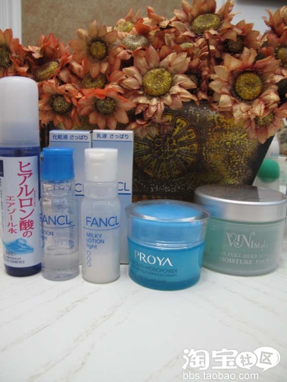 乳液篇:第1瓶是中日合资的一个牌子,是喷雾,没什么太大的感觉! 我用得是FANCL 白盖那瓶,乳液,很清爽,蓝色罐是珀莱雅的,大S做的那个,者喱很舒服!绿色罐是韩国的,海藻成份的,可以当乳液用,可以当面膜,可以当妆前乳! 超好!是者喱质地的!