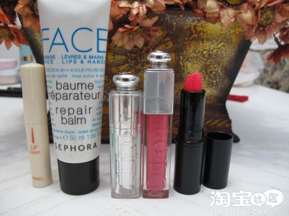 第1是FANCL家的唇膏挺好的,无色无味,就是用得太快了。好心疼!2是丝芙兰家的乳木果,可当手霜,可用在脸上当面膜,可以用在唇上。超大支!用了好久! 3和4是DIOR 的唇膏和唇彩。很不错!效果,颜色都很美!DIOR家的彩妆不错!最后那个是芭比娃娃的唇膏,是韩国代回来的!颜色很漂亮真的像芭比娃娃的嘴!不过太美了,我如果不穿得很公主一都不敢用!有点怪怪的!