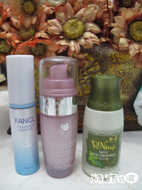 精华液篇:第1是FANCL家的,补水的。第2是兰蔻的水份缘,第3是韩国的清痘系列的。精华是很好的东西必须用!不用乳液都不能不用精华!吸收非常的好!贵是贵但这个钱不能省!精华可以当眼霜用!吸收比眼霜好!MM们可以把眼霜的钱省了哟!