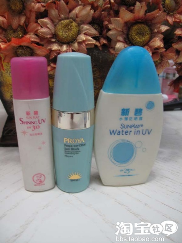 防晒霜:粉盖的是曼秀雷敦家的挺好的,里面有珠光,夏天用在身上不错,用在脸上有点怪!,第2是珀莱雅家的,非常的好,不油,很清爽!很意外!第3大瓶是曼秀雷敦家的。可用在脸上,身上!很清爽!日本的防晒都很清爽!