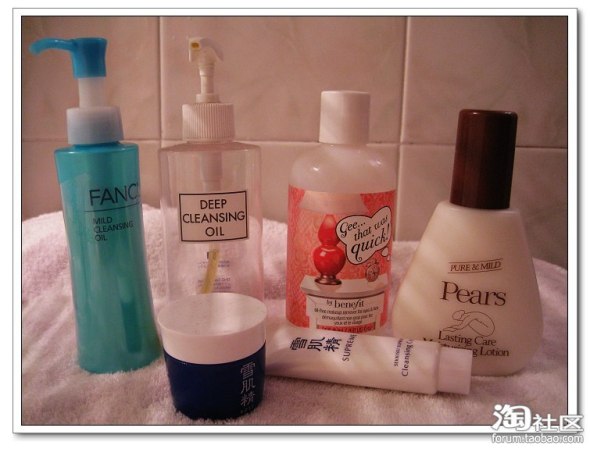 依次是:fancl卸妆油,DHC橄榄油卸妆油,Benefit无油卸妆水,Pears润肤乳液,雪肌精的洁颜霜