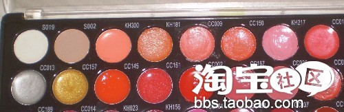 4.在颧骨位扫上淡粉色胭脂,木子的唇色比较红,所以要先用S002打底,再用KH217填满整个唇部,最后在唇中央点上图中的唇彩,增加光泽度!